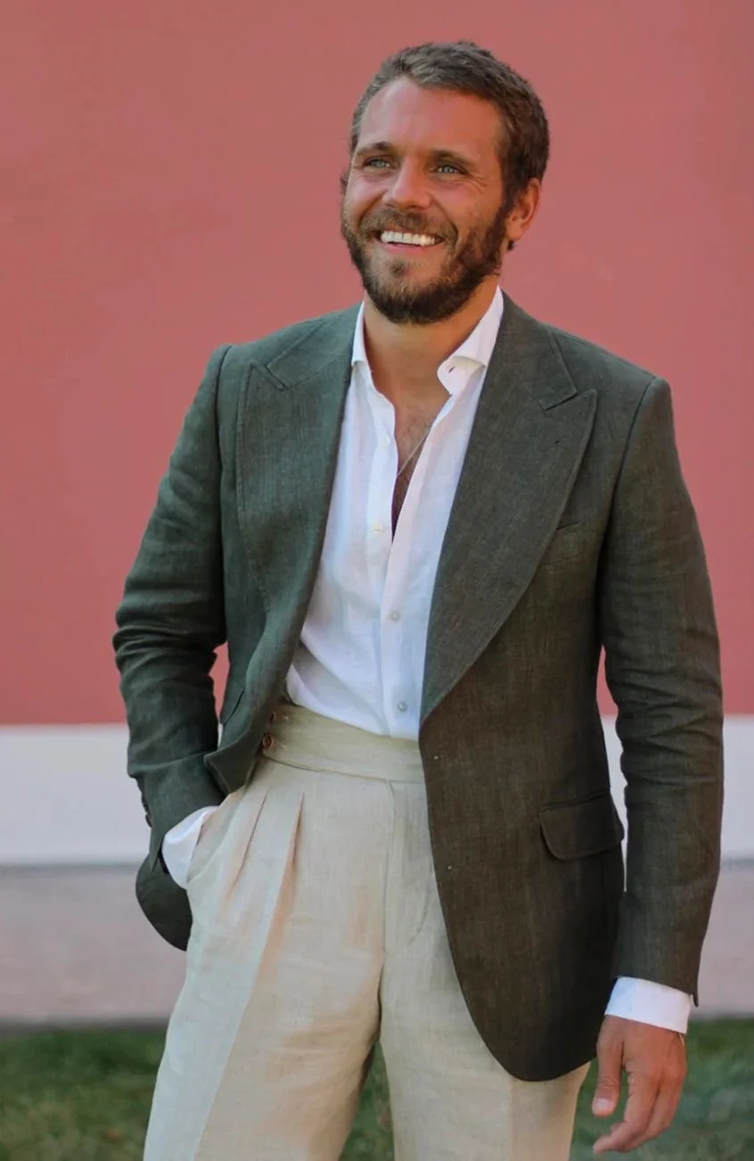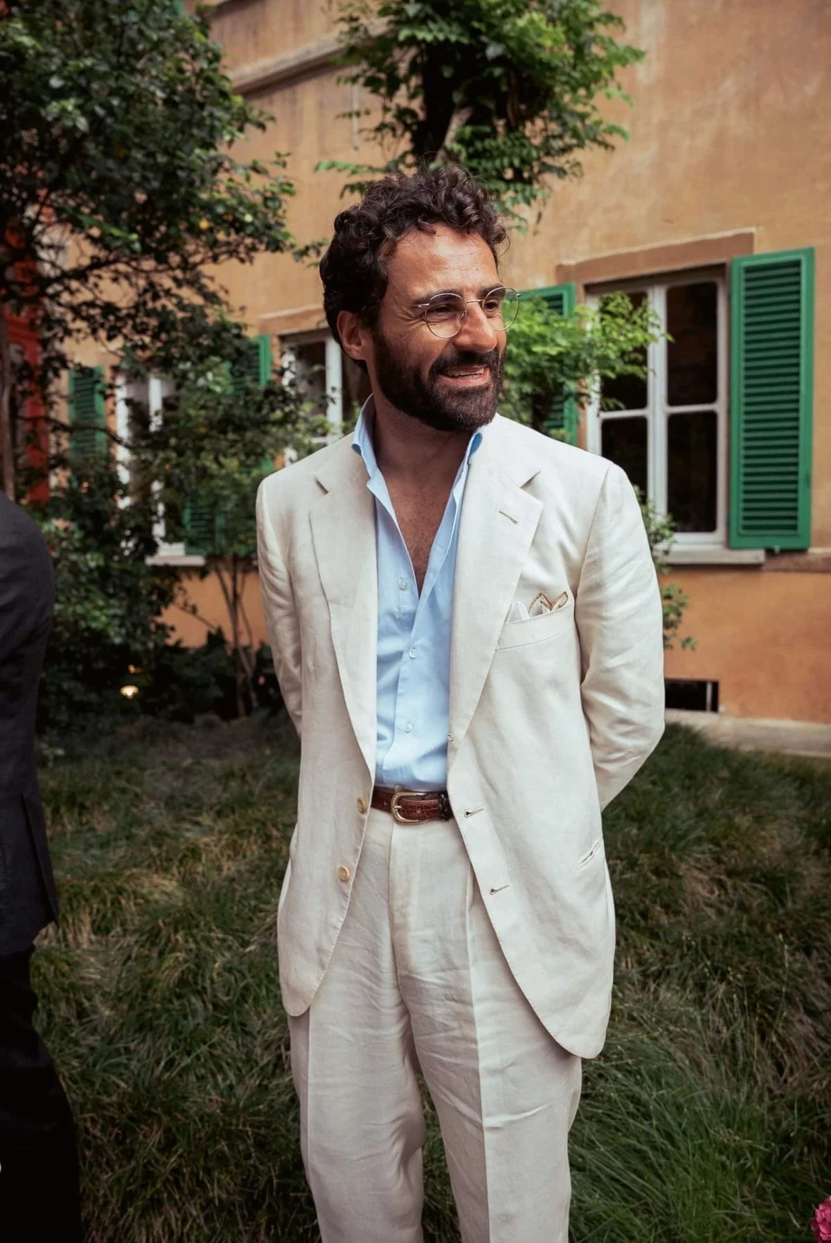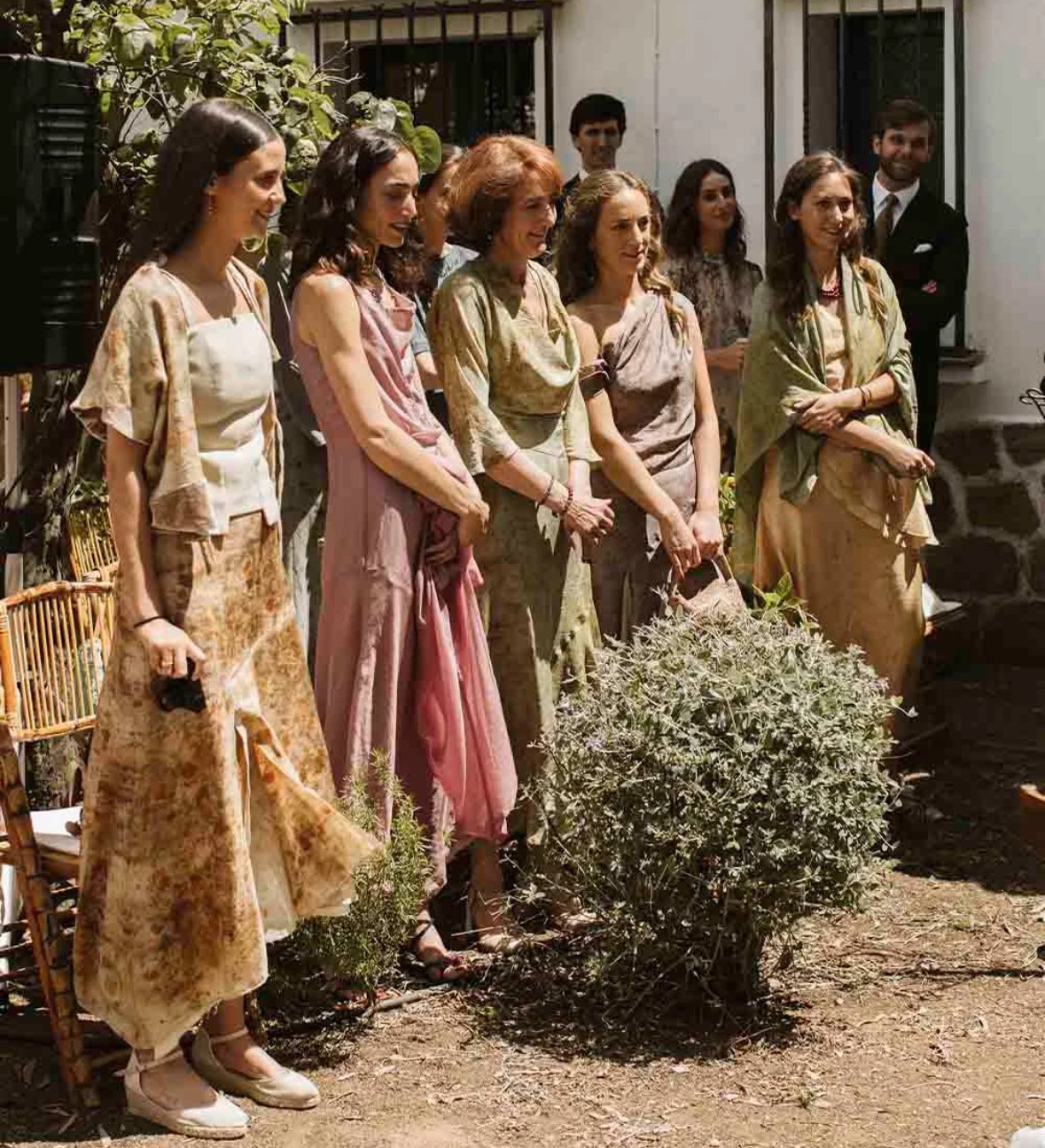El novio llevará un traje de lino sin corbata en tono claro y nos gustaría que se siga la misma paleta: traje de lino o mezcla ligera sin corbata. Si no tienes traje de color claro, no es ningún problema. Os recomendamos camisa blanca o en color claro.